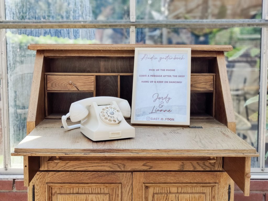 Naast onze photobooth bieden wij ook de Gast-o-foon aan, een audio gastenboek dat een geweldig alternatief is voor het traditionele gastenboek!